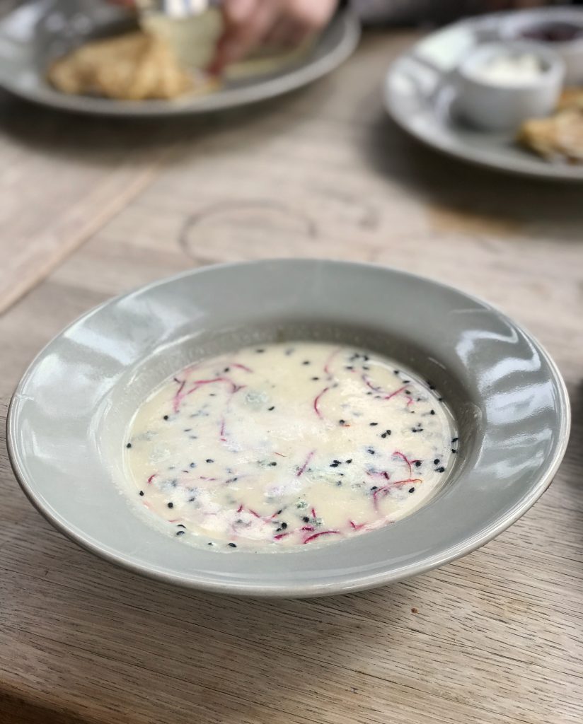 Efter en stund blev barnen lite hungriga, vi också för den delen, så det fick bli en härlig lunch på caféet. Barnen smaskade i sig pannkakor medan M åt en räksallad och jag njöt av en fantastisk blomkålssoppa med mögelost ?