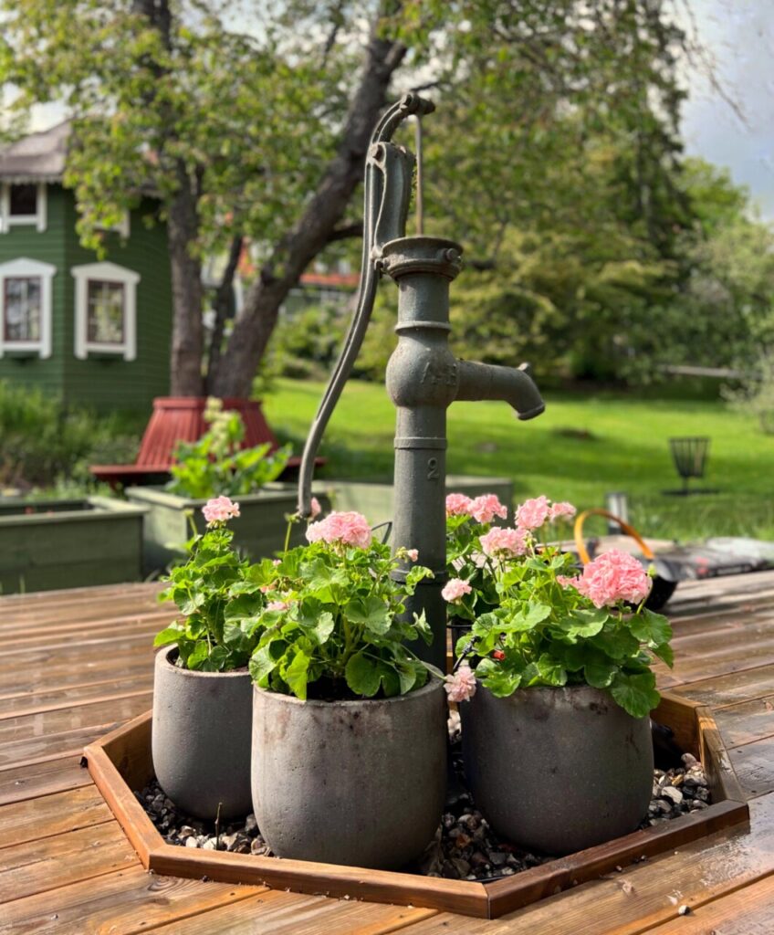 Runt den gamla vackra, om än lite slitna, pumpen valde jag att plantera Mårbacka i år. Det är verkligen något alldeles extra med den sortens pelargon. Jag vet att de kan bli lite rangliga och kanske får det tufft med blåsten men jag valde ett gäng som såg relativt kraftiga och låga ut så nu håller vi tummarna.