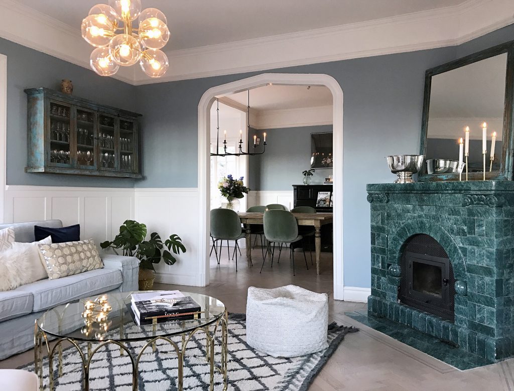 Vaknar till en underbart solig söndag, tassar ner i köket och gör mig en latte. Solens strålar letar sig in överallt och fullkomligt studsar runt på våra nymålade väggar. De har varit blå i tanken så länge nu att det känns alldeles självklart. Tänk att en väggfärg kan göra en så enormt stor skillnad. Helt plötsligt känns allt så ombonat och alla möbler kommer fram och får en ny karaktär.