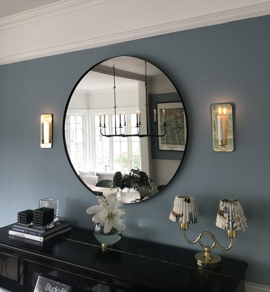 Så, finns det några regler att förhålla sig till när man inreder med speglar? Egentligen inte mer än att våga gå all in! Låt den där runda detaljen få en central plats och våga ta ut svängarna. När jag valde spegel till vår matsal hade jag först spanat in den (https://www.bybinett.se/moebe-wall-mirror-brass-70) modellen. Fullkomligt älskar den men eftersom jag hade en begränsad yta att förhålla mig till med pianot som tar upp en stor del av väggen skulle fästet ta upp för stor plats och jag skulle bli tvungen att gå ner i storlek på själva spegelytan. Eftersom all in är grejen skulle det bli ett ganska fjuttigt intryck med en så pass liten spegel på den ändå ganska stora väggen.