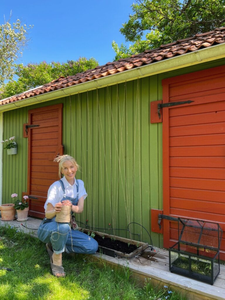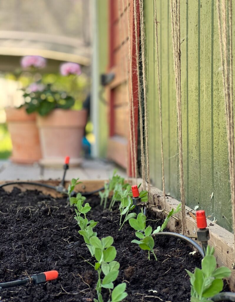 För att ge stöd åt luktärterna, något de kan klättra på, knöt jag hampasnöre utmed fasaden på vår friggebod. Jag har placerat skruvar precis bakom plantorna samt uppe vid takrännan. Jag knyter fast snöret vid första bottenskruven och trär sedan snöret upp och ner med en liten snurr vid varje skruv. Verkligen ett superenkelt, billigt och ganska diskret sätt att skapa sig en vägg av luktärter.