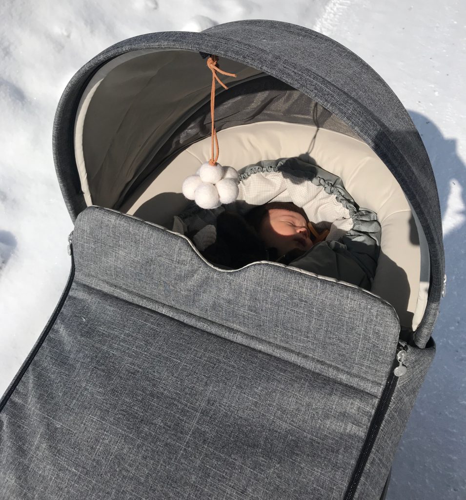 Det blir inga långa turer då hon redan lyckats få sin första förkylning, antagligen helt omöjligt att undvika med tre äldre syskon i förskola och skola… Hon klarar det dock bra med koksaltlösningsdroppar i näsan och sittande sovläge. I vagnen ligger hon varmt och skönt med dunåkpåse, fluffig liten overall och mysig ullmössa så lite frisk alpluft är nog bara bra. Vi har hållit oss inne de svalast dagarna för att vara på den säkra sidan men här på bilderna var det -3 och strålande varm och skön sol ☀❄☀.