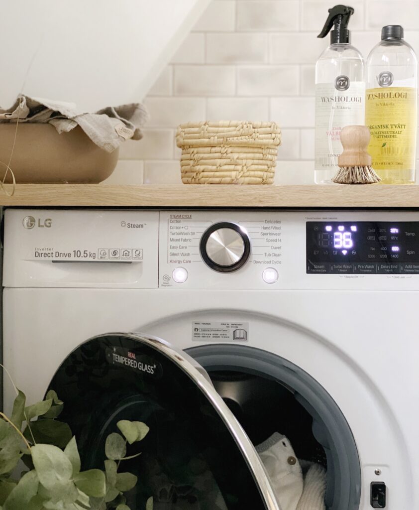 Den snyggt matchande tvättmaskinen är en (https://www.elgiganten.se/product/vitvaror/tvattmaskin/26287/lg-tvattmaskin-fv90vns2q). Den har 9kg kapacitet, vilket gott och väl täcker mina tidvis omfattande tvättbehov.