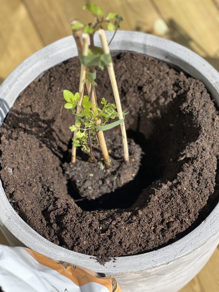 Steg 4: Plantera Klematis. NĂ€r det Ă€r dags att plantera, grĂ€v en grop i mitten av krukan som Ă€r tillrĂ€ckligt stor för att rymma plantans rotsystem đŒ Placera Klematis i gropen nĂ„got djupare Ă€n den var i sin ursprungliga kruka, vilket uppmuntrar starkare rottillvĂ€xt. TĂ€ck rötterna med jorden och packa den lĂ€tt runt plantan för att hĂ„lla den stadigt pĂ„ plats.
