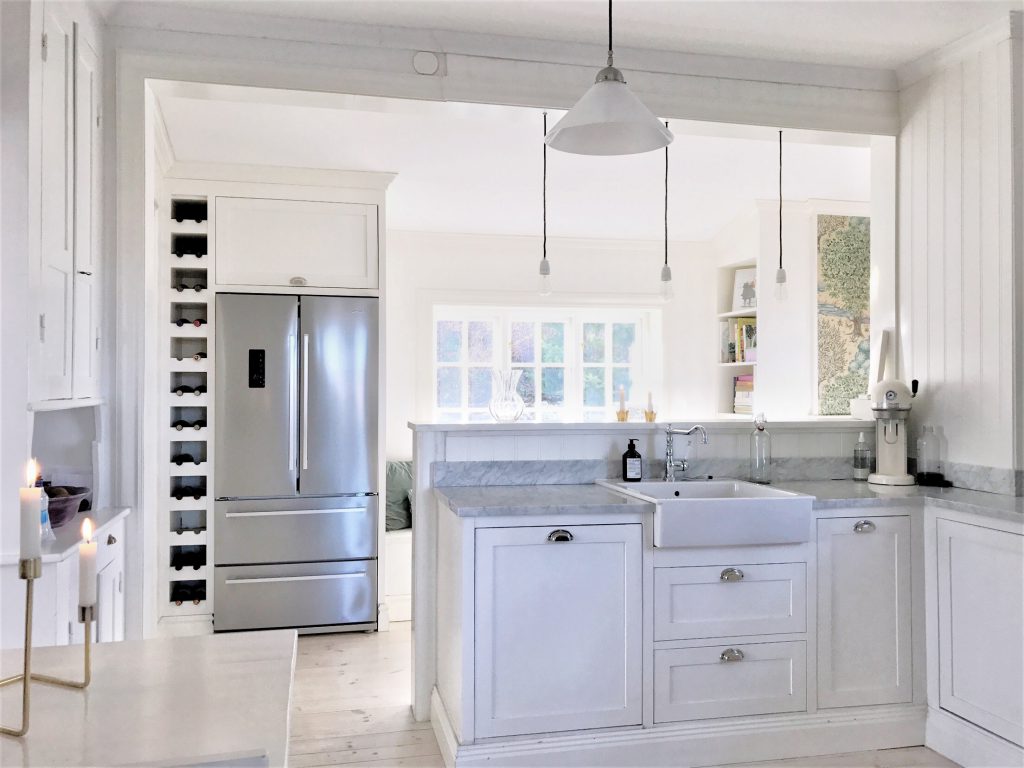Där de tre lamporna hänger bakom diskhon fanns då vår yttervägg och köket var betydligt mindre men det var ändå alldeles underbart, köket är ju liksom själva hjärtat i hemmet. När väl byggfirman kom in växte köket och vi fick både sittbänk och en ordentlig kyl/frys från Smeg som vi är jättenöjda med.
