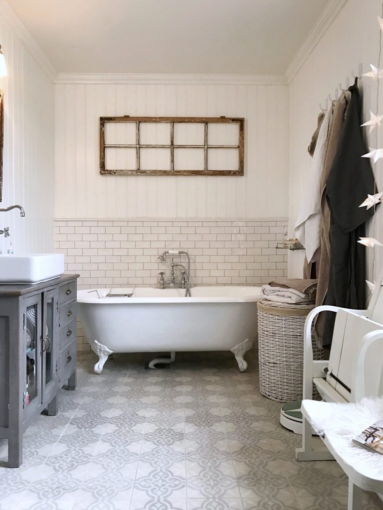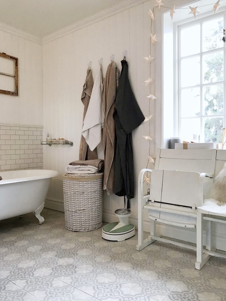 Idag har jag såpat våra badrumsgolv med härlig vitpigmenterad såpa. Oj vad det behövdes… Inser att jag borde göra det här oftare. Det är ett sånt där jobb som man skjuter på hela tiden men när det väl är gjort känns det inte alls så jobbigt och dessutom blir resultatet så himla härligt. Inte nog med att man får bort all smuts från fog etc, det ser ju verkligen för trist ut, golvet blir dessutom sidenmatt. Det är alldeles underbart skönt att gå på efter en ordentlig såpning, det känns alldeles mjukt.