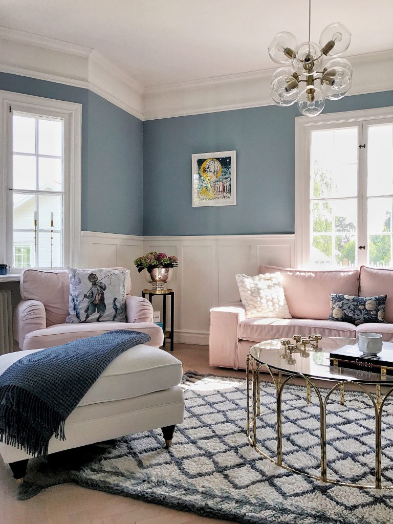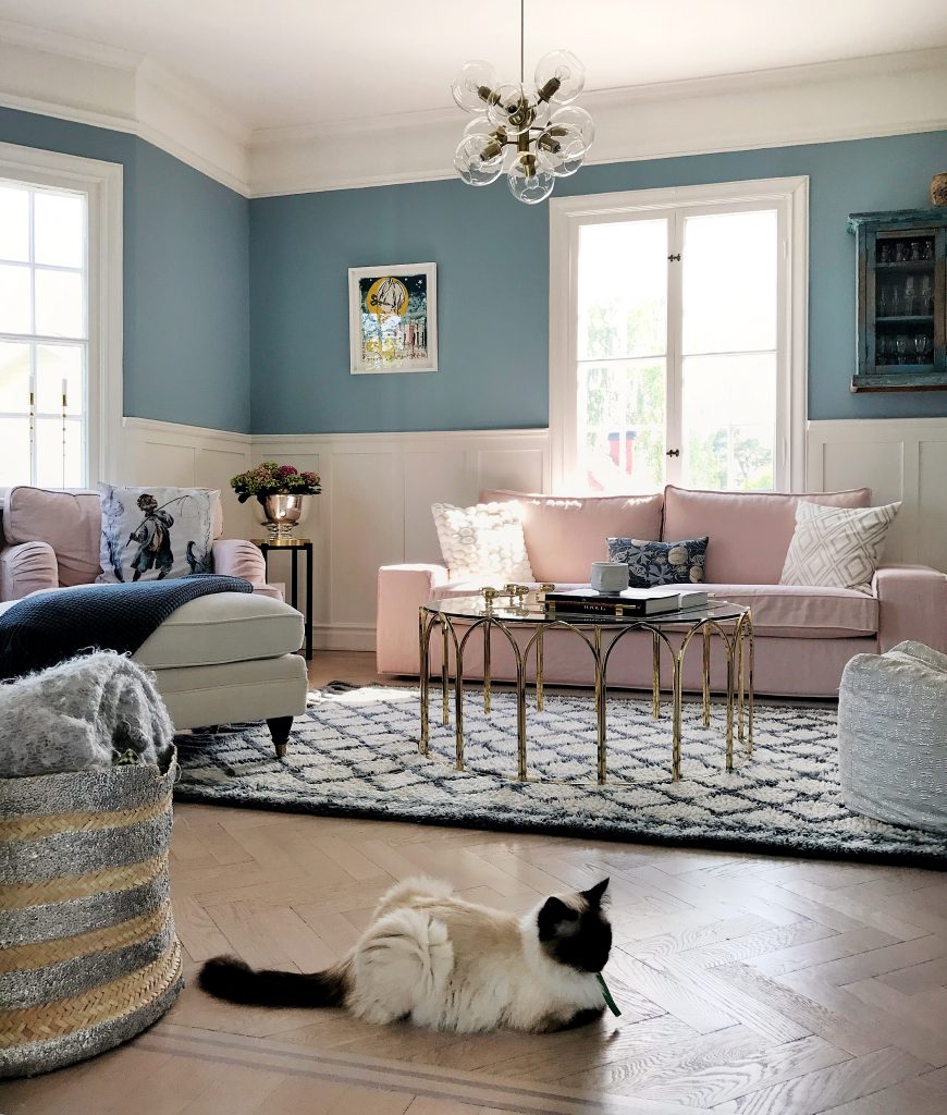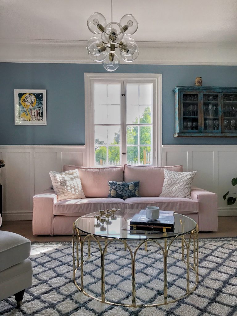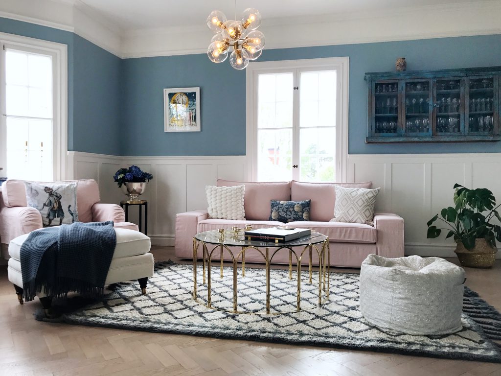 Jag började med att beställa hem tygprover vilket var smidigt men verkligen inte ett lätt val, det finns inte mindre än drygt 250 tyger att välja bland! Vi har ju haft ett överdrag från (https://bemz.com/sv/articles/models/soffoverdrag/kiv1-u/?fabric=DG2107) i tvättat linne med passformen Loose Fit Urban innan och därför kände jag att vi skulle ta en mer klassisk passform den här gången. Det är ju roligare ju större förändring man lyckas få till :-) Dessutom var målet just att få dessa rum en smula mer tidlöst klassiska. En rosa soffa har jag som ni vet gått och drömt om jättelänge så det var ett självklart val och då fick väggarna bli blå (det kan ni läsa om (https://www.hannasanglar.se/2017/05/mondy-funday-andra-med-farg.html/) och (https://www.hannasanglar.se/2017/05/himmel-bla-himmel-bla.html/)).