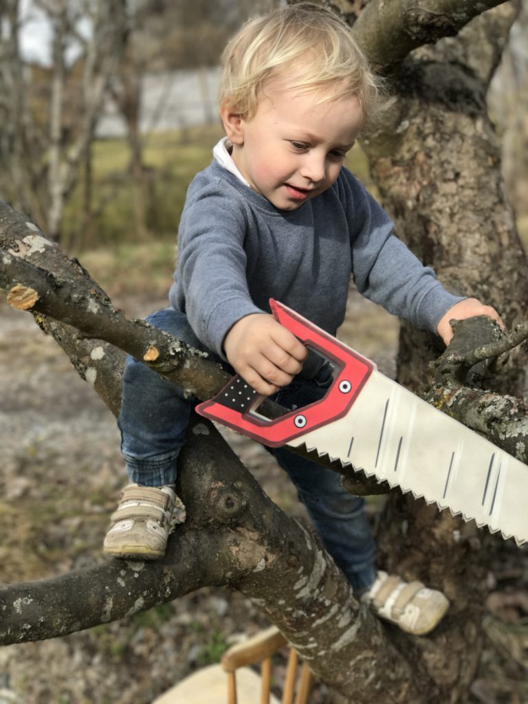 Vilhelm ville såklart vara med och fixa han också så han sprang in och hämtade sin såg och sedan var det bara för mig att vakta honom när han klättrade omkring bland grenarna och låtsassågade.